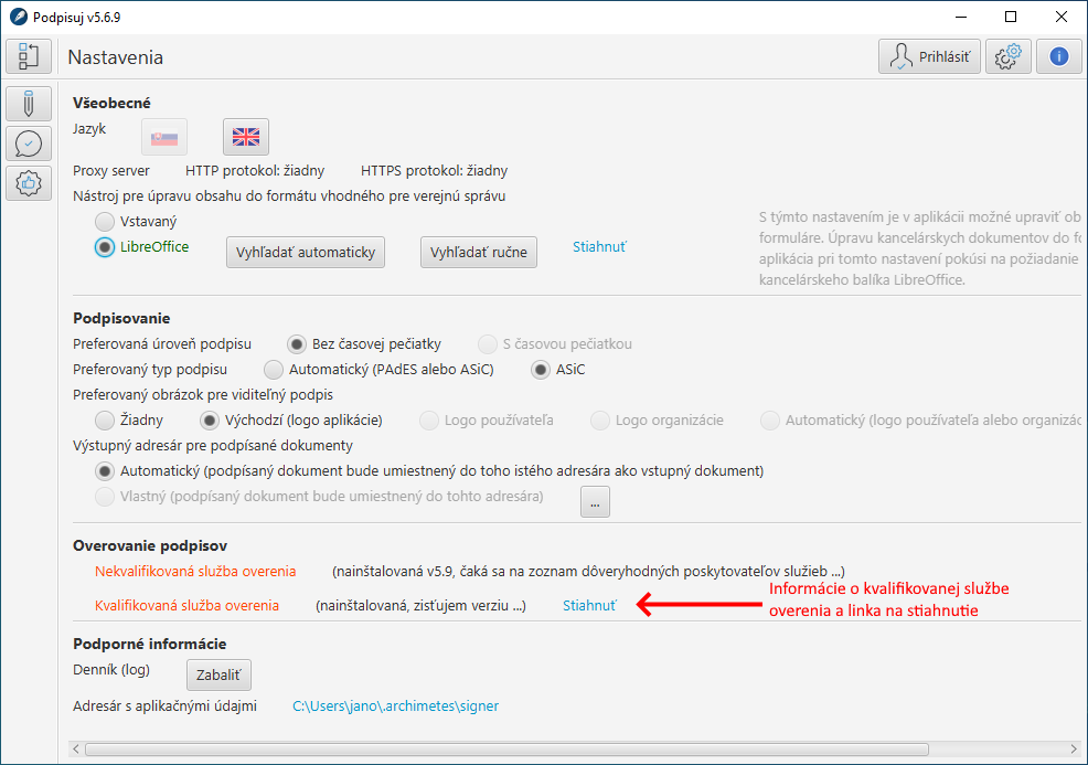 Nutným predpokladom použitia služby je nainštalovanie pomocného softvéru SecuSign Java SDK. Odkaz na stiahnutie softvéru nájdete na obrazovke nastavenia, ktorá zároveň obsahuje aj informáciu o stave a dostupnosti kvalifikovanej služby overenia.