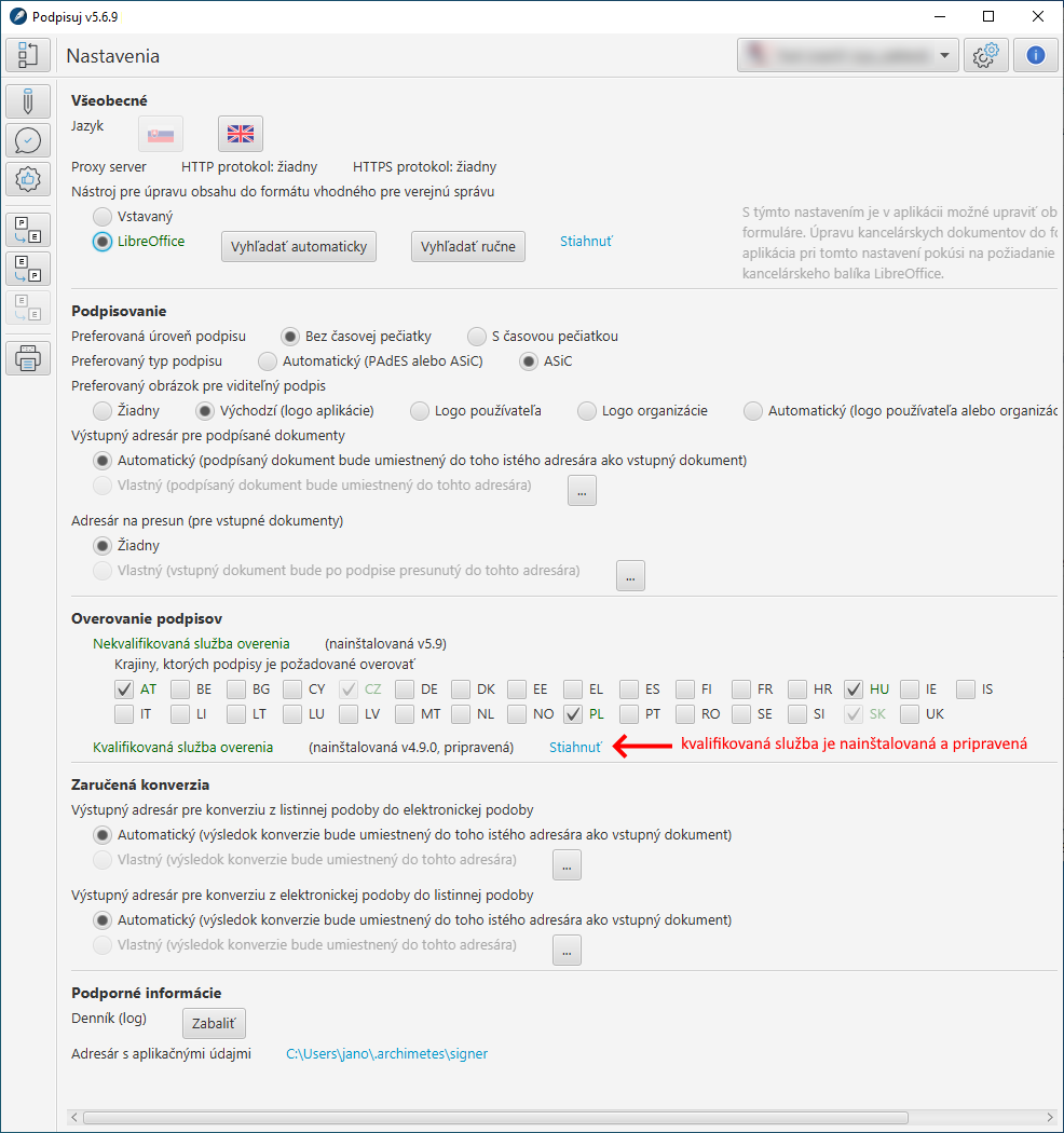 Po inštalácii softvéru a prihlásení sa do aplikácie by mal stav, v ktorom je možné službu kvalifikovaného overenia použiť, vyzerať nasledovne: