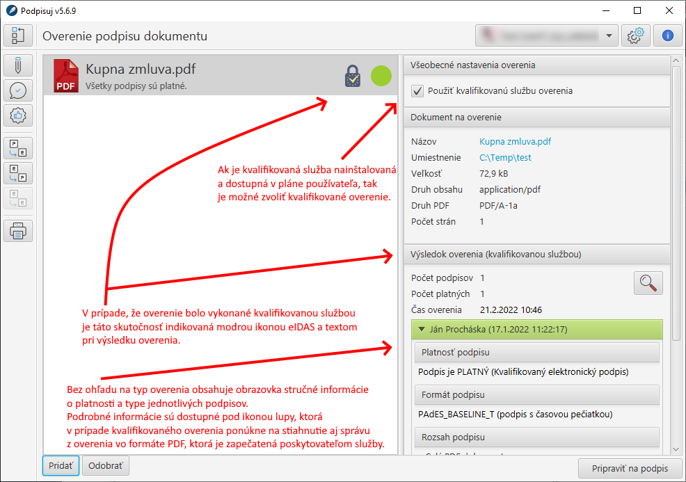 Ak je kvalifikovaná služba nainštalovaná a používateľ je prihlásený, tak kvalifikované overenie je dostupné na obrazovke overenia podpisu. Indikátorom je voľba "Použiť kvalifikovanú službu overenia", ktorá je v takomto prípade označená. Z pohľadu používateľa funguje overenie obdobne ako pri nekvalifikovanej službe a v oboch prípadoch sú zobrazené stručné výsledky z overenia. V prípade kvalifikovanej služby obsahujú správy z overenia (ikona lupy) aj zapečatenú správu vo formáte PDF, ktorá je dôkazom, že overenie prebehlo kvalifikovanou službou a výsledok garantuje kvalifikovaný poskytovateľ.